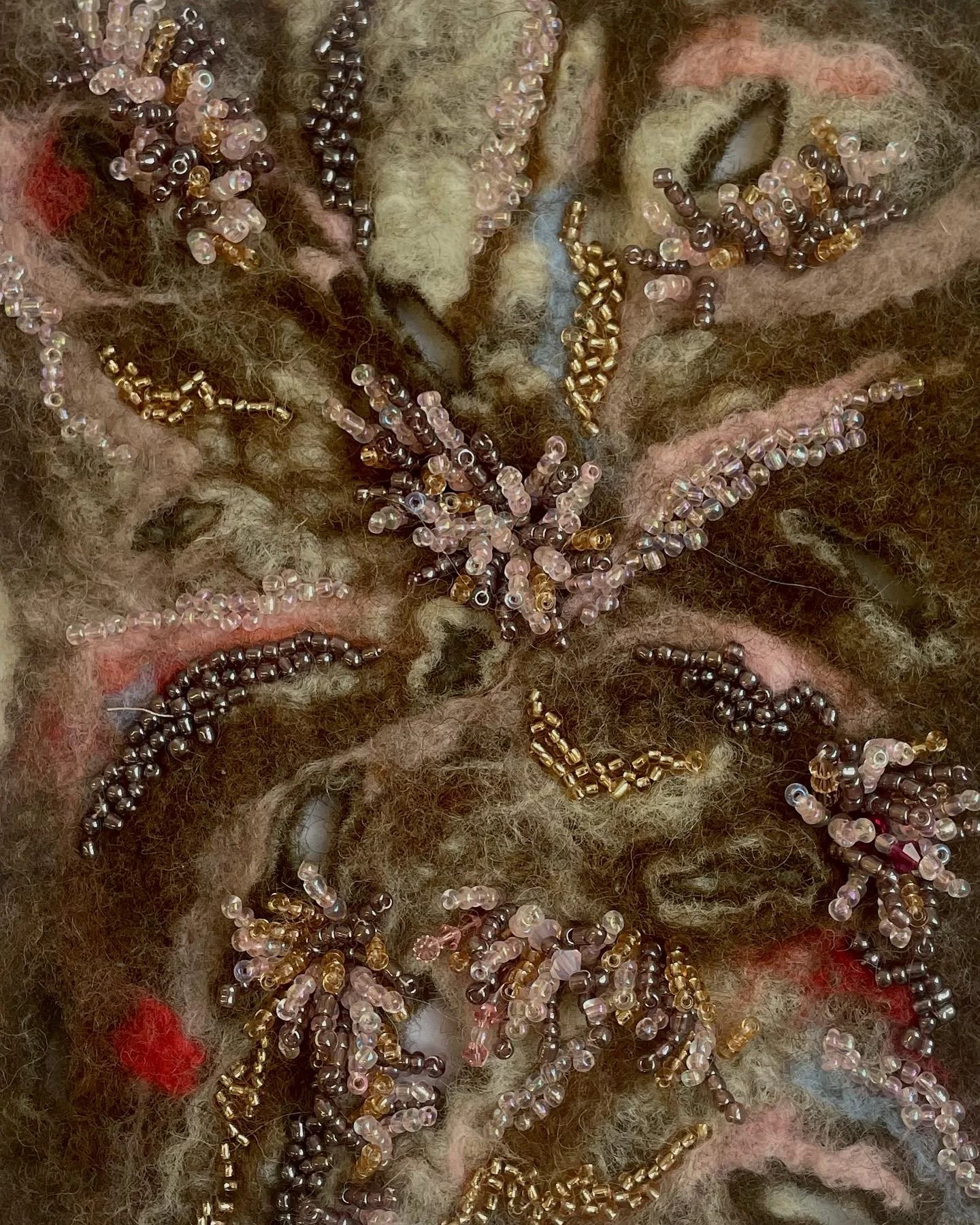 Wet Felting, Wool Roving, Glass Beads, Cut-out Sections.