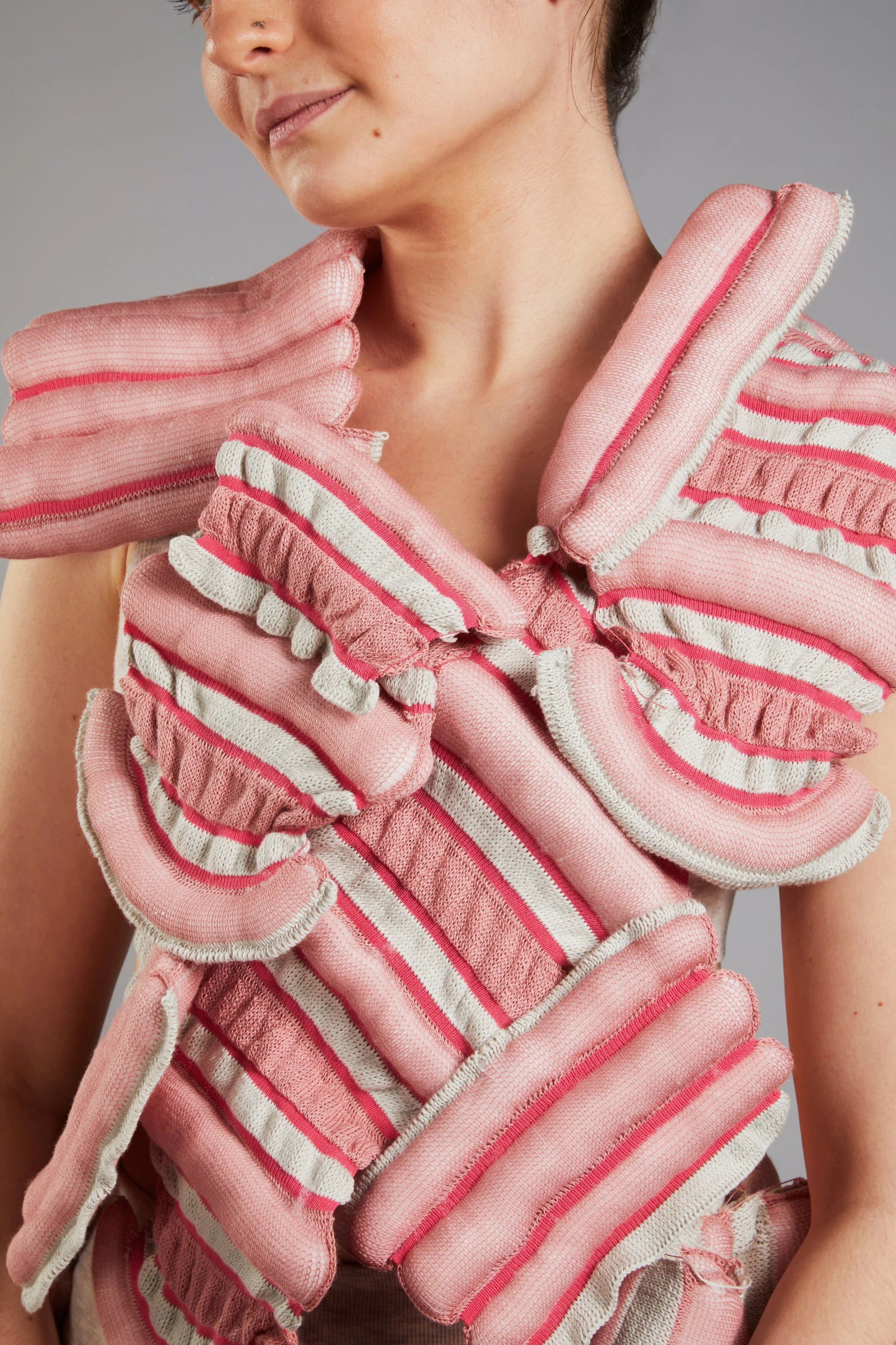 ‘Beauty Unveiled’ is a knitwear collection that redefines perceptions of the female body, celebrating natural forms and lived textures such as wrinkles, folds and cellulite. Through expressive knit structures, the project honours these marks as beautiful, powerful traces of life’s journey.
